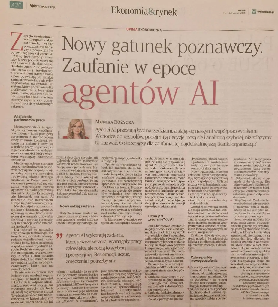 Źródło: Publikacja: 21.10.2025 05:06 Rzeczpospolita, https://www.rp.pl/opinie-ekonomiczne/art43203341-monika-rozycka-nowy-gatunek-poznawczy-zaufanie-w-epoce-agentow-ai